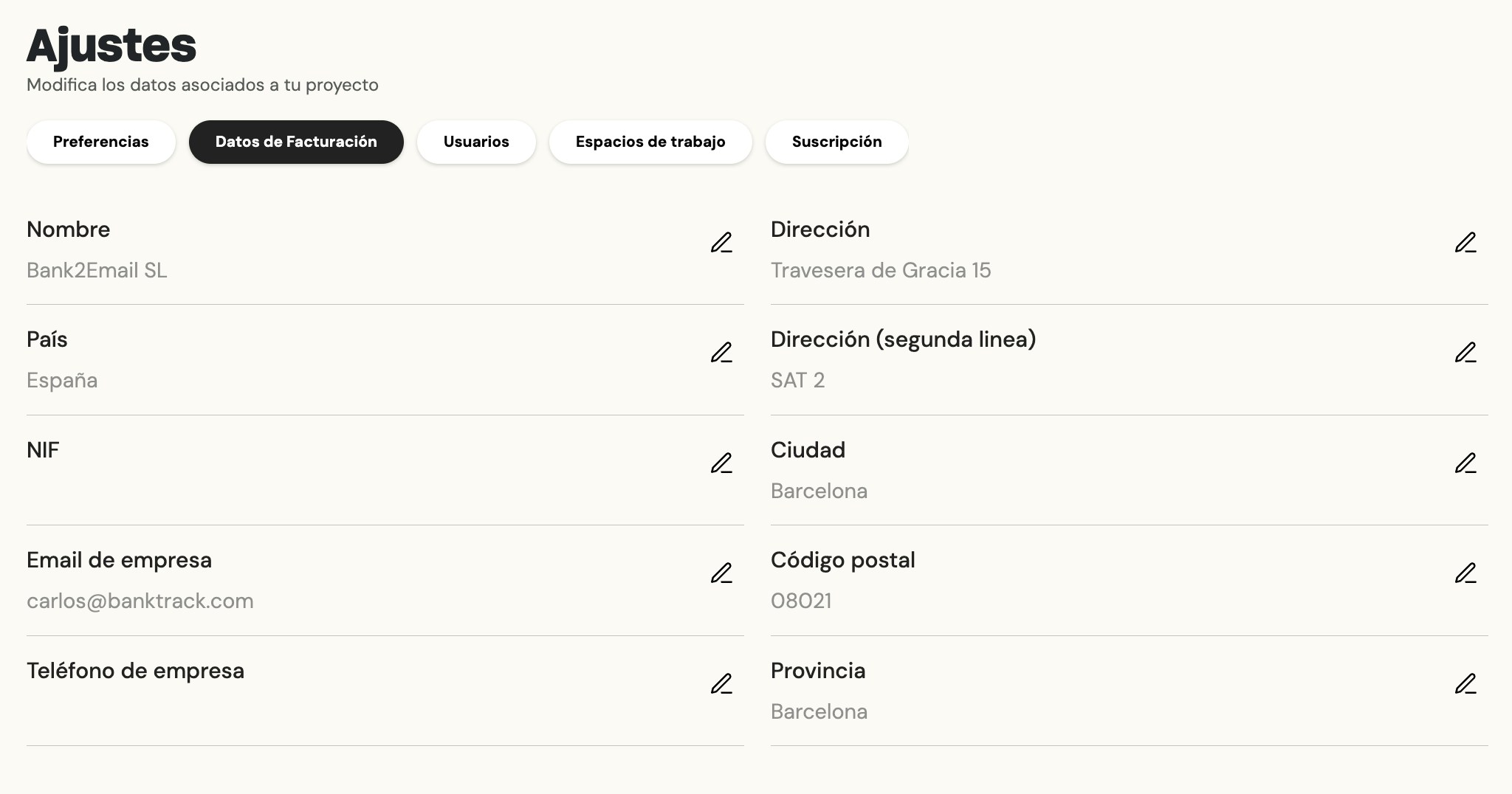 Actualiza los datos de facturación de tu cuenta de Banktrack.