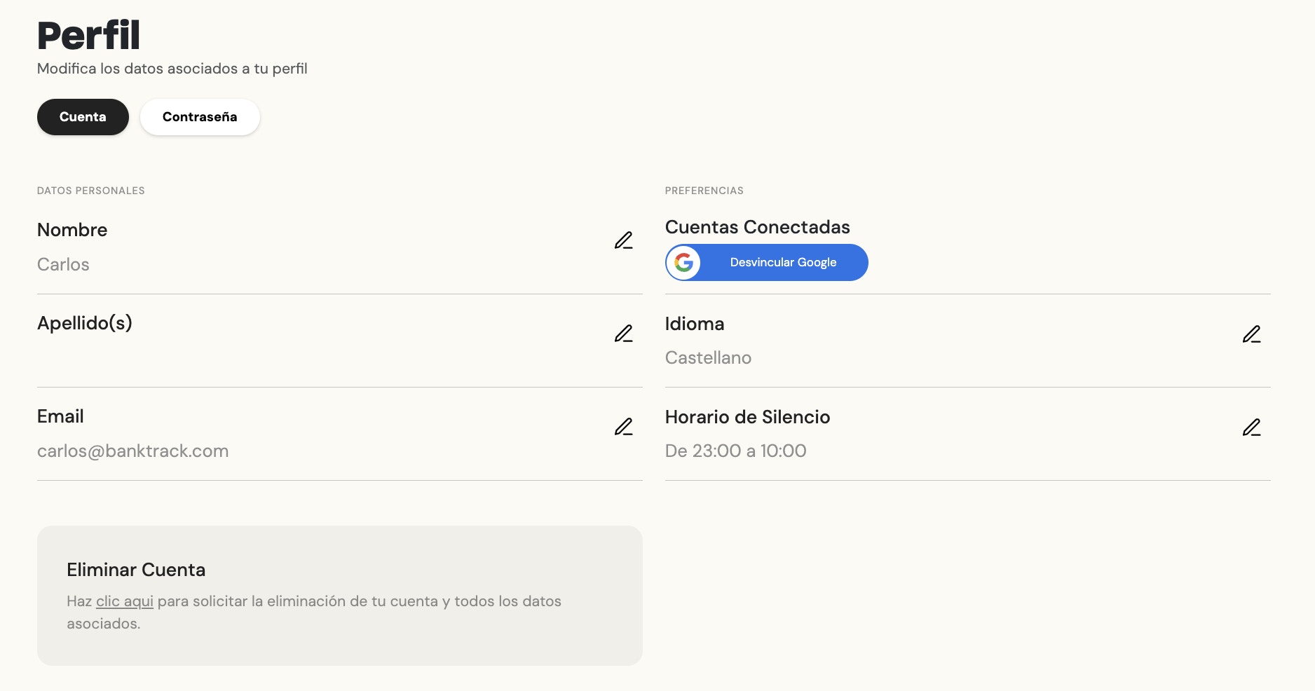 - Vinculación con tu cuenta de Google: para acceder a Banktrack con Google.