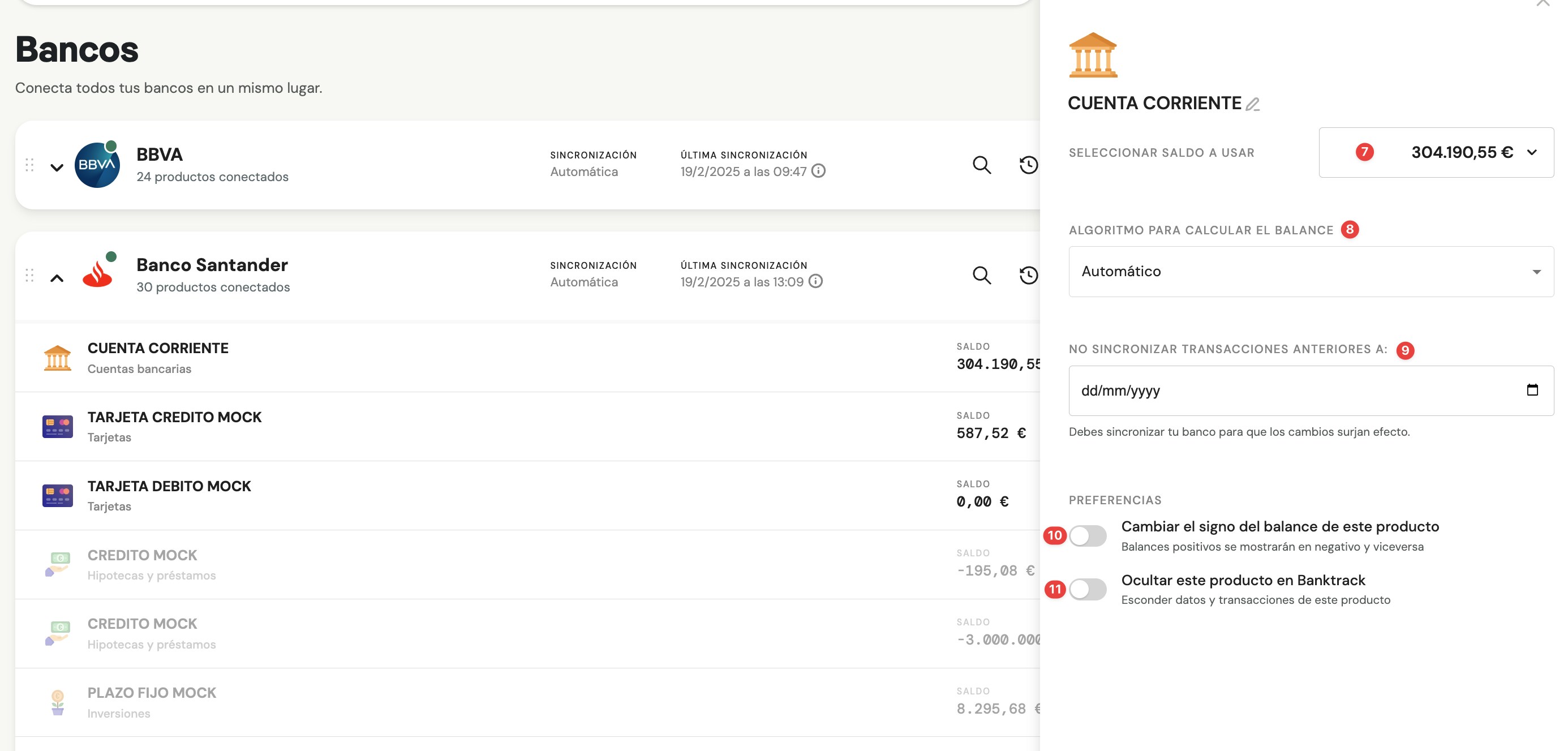 En algunas ocasiones, dependiendo del banco y tipo de producto, puedes seleccionar el saldo que quieres visualizar en ese producto en tus paneles de Banktrack.