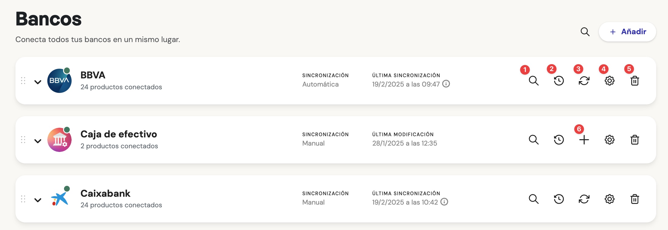 Aquí podrás ver un histórico de las últimas sincronizaciones que se han realizado en cada banco.