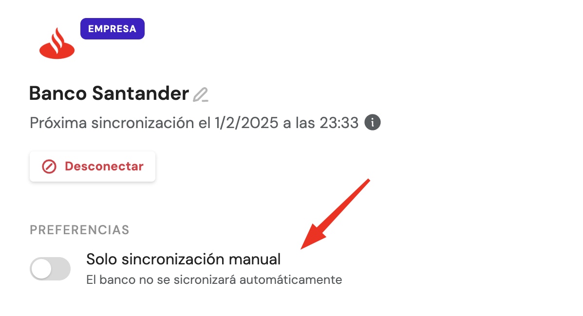 Si prefieres tener solo sincronización manual, puedes desactivar la sincronización automática desde los ajustes del banco. Esto detendrá las actualizaciones automáticas y las transacciones solo se actualizarán cuando lo decidas, presionando el botón de 🔄 Sincronizar.