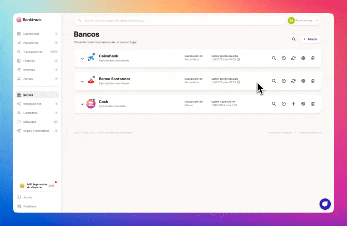 Si necesitas actualizar los datos al instante, puedes forzar la sincronización desde la sección Bancos, pulsando el botón 🔄 "Sincronizar".