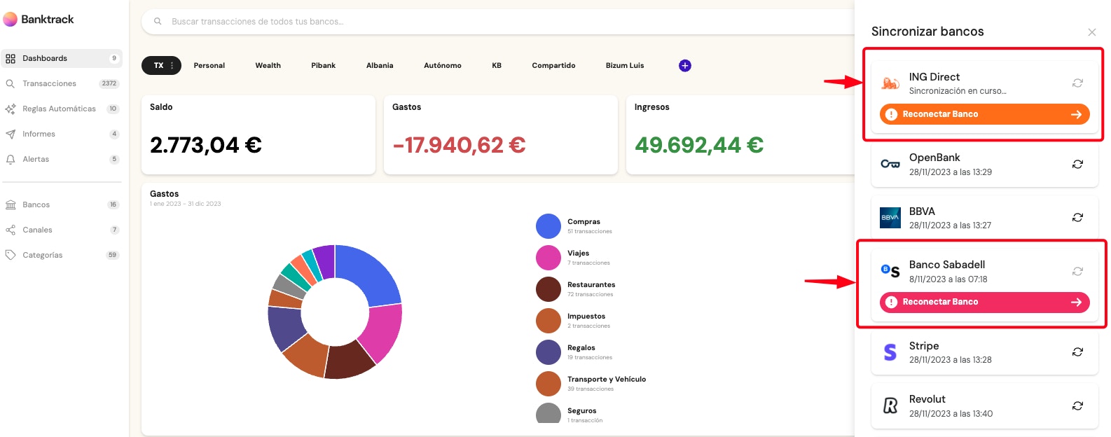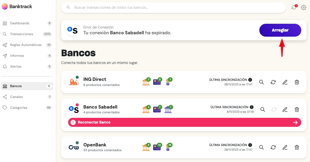 If the message displayed is orange, it indicates a temporary synchronization error. In this case, it is recommended to wait for the error to be resolved automatically, as it usually gets fixed in subsequent automatic synchronizations. If you need to perform a sync at that moment, you can click the Reconnect Bank button and re-enter your credentials to force the reconnection.