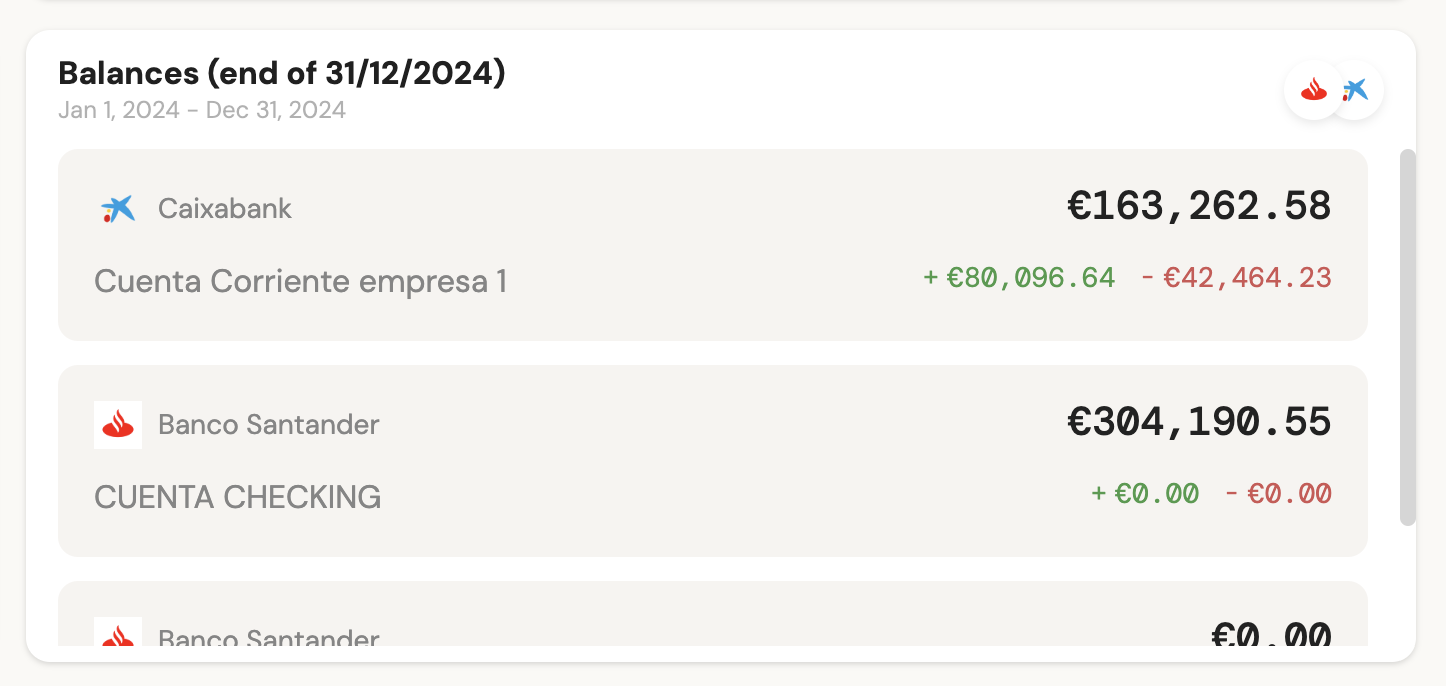 1 - List of accounts: Used to display the balances of products. There is an option to choose between the balance at the end of the period (set at the top of the dashboard) or the latest known balance (the most recent).