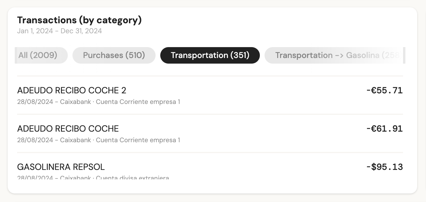 3 - List of transactions: Used to display transactions, either only income or only expenses. Additionally, you can perform different groupings if desired: by category, date, connection, or banking product.