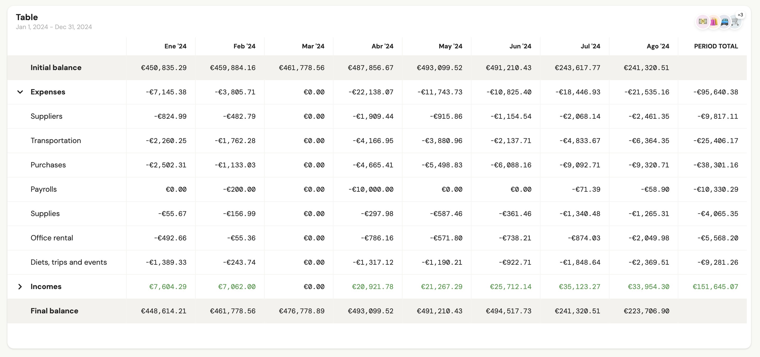 3 - Combined bar and line chart: To visualize income and expenses in columns along with the evolution of the final balance for each period.
