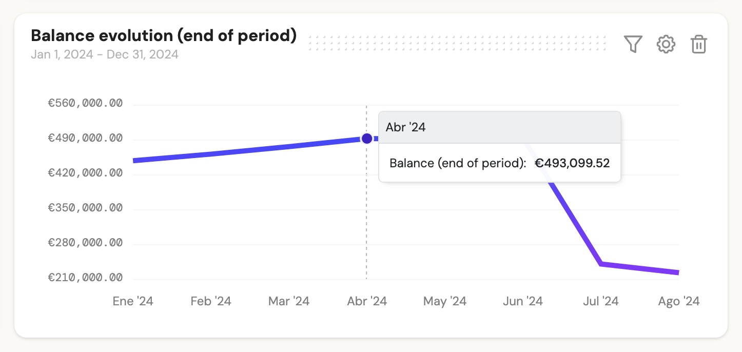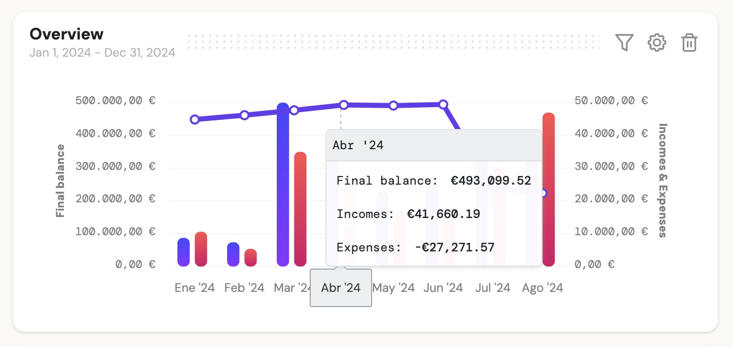 2 - Line chart: To show the evolution of expenses, income, or balance. You will have information at the daily level and can scroll through the chart to view details in a tooltip.