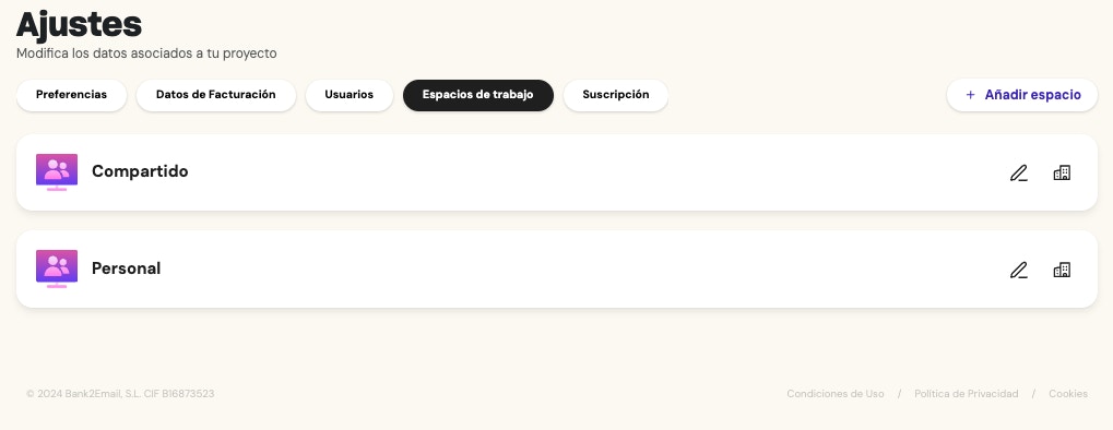 Workspaces allow you to organize your finances for different companies or projects in completely independent dashboards, each with its own banks, users, categories, dashboards, etc.