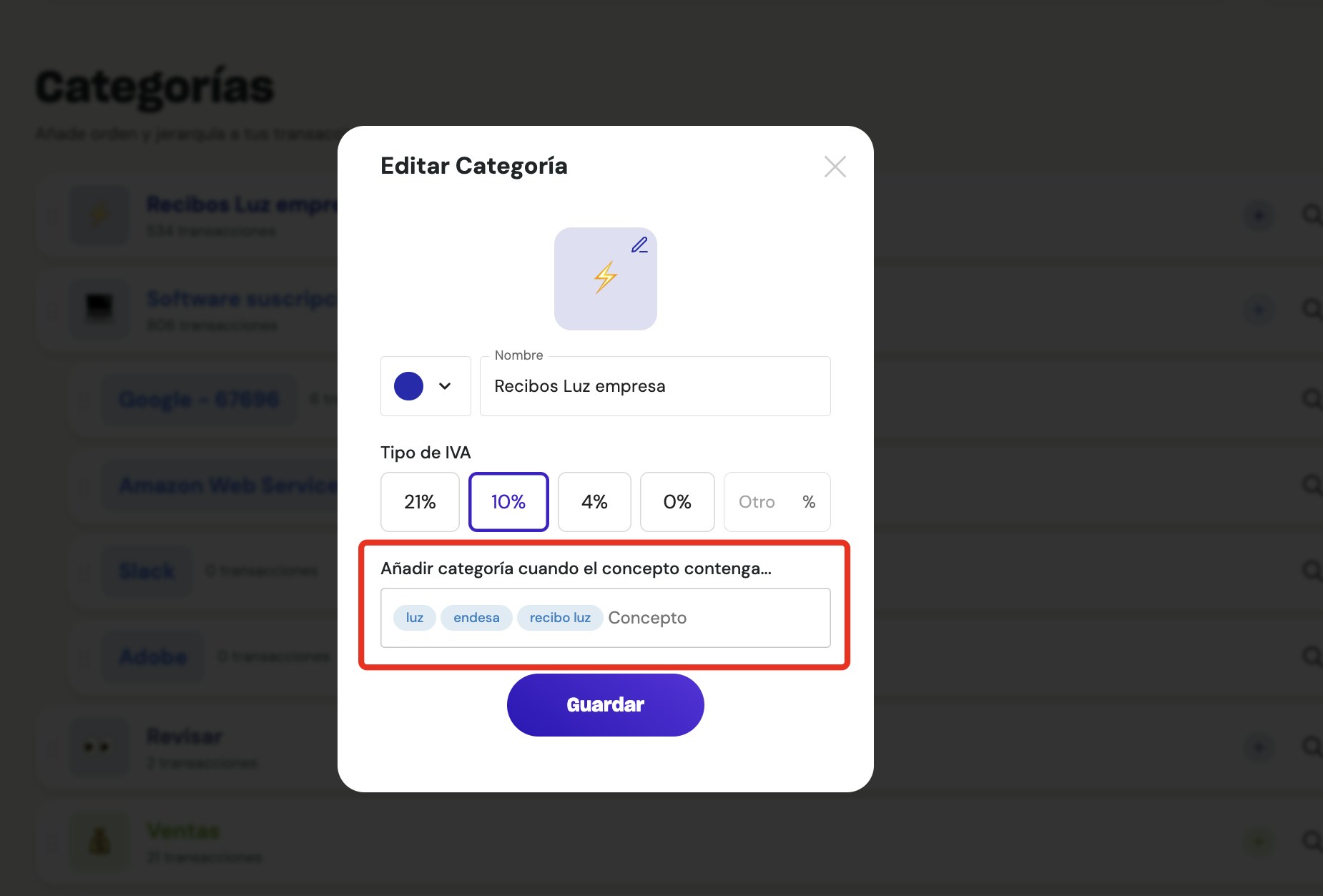 When a transaction contains one of those keywords in its description, the corresponding category will be applied. This functionality will automatically apply the category to both the transaction history and all new transactions.