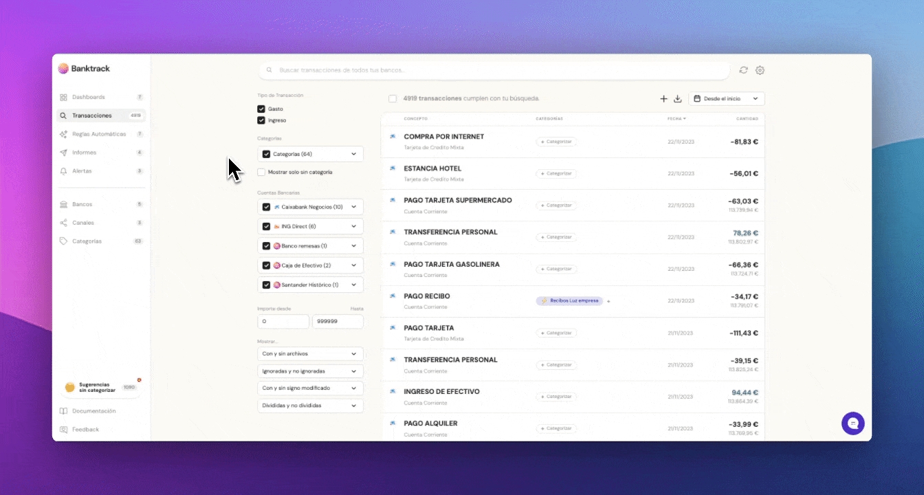 From the transaction search, you can ignore transactions to prevent them from being counted as income or expenses. This is very useful to avoid double entries for income and expenses in transfers between your own accounts, for example.