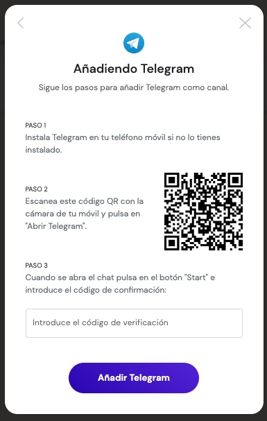 Recibirás un código en el chat que debes introducir en la siguiente pantalla para validar que el número es correcto. Y tras esto, pulsar en Añadir Telegram para crear el canal.