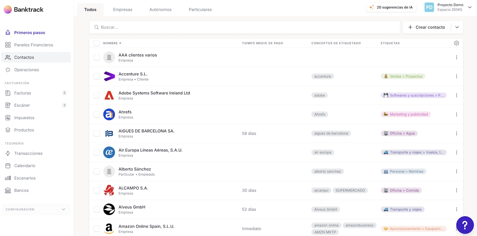 Desde esta vista verás el listado completo de contactos (empresas, autónomos y particulares) con su nombre, tipo y otra información relevante.