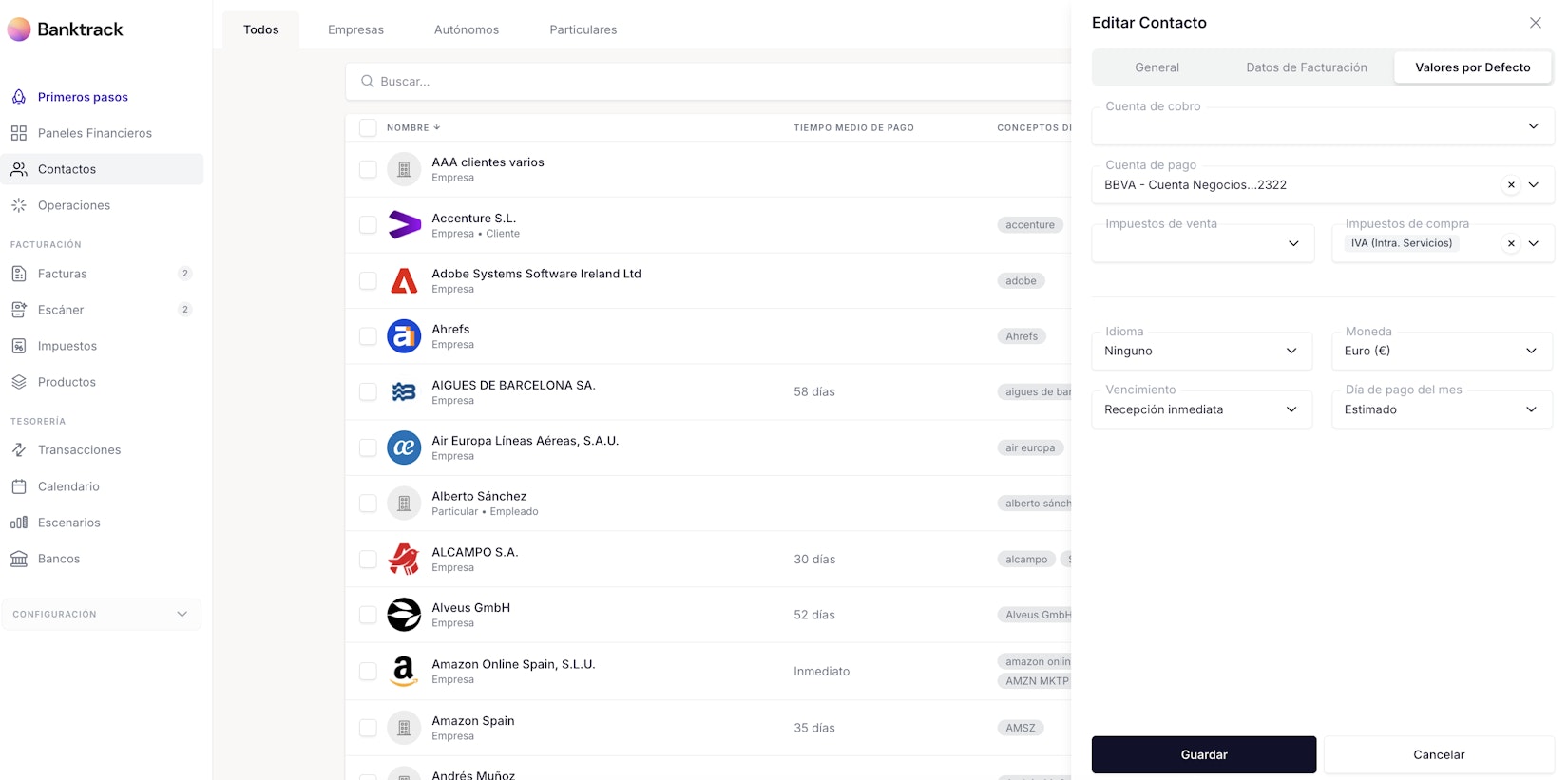 Aquí defines la configuración que Bantrack utilizará por defecto al emitir facturas o escanear documentos vinculados a este contacto.